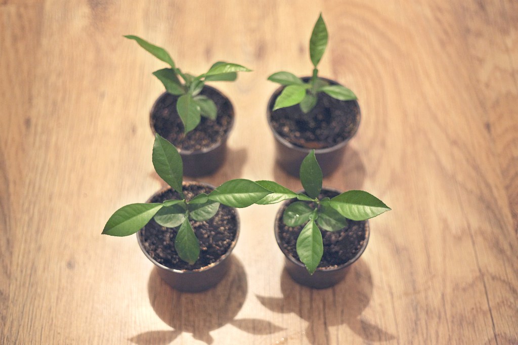 Kilkumiesięczne sadzonki po pierwszym przesadzeniu, Poznań 2014 Gdy sadzonki miały 4–5 cm wysokości, rozsadziliśmy je do osobnych doniczek. I tak rosły przez następne tygodnie. Część z nich była skarłowaciała i słabo rosła, więc została odrzucona. Zostało kilkanaście drzewek, a po kilku miesiącach przesadziliśmy je do większych doniczek.