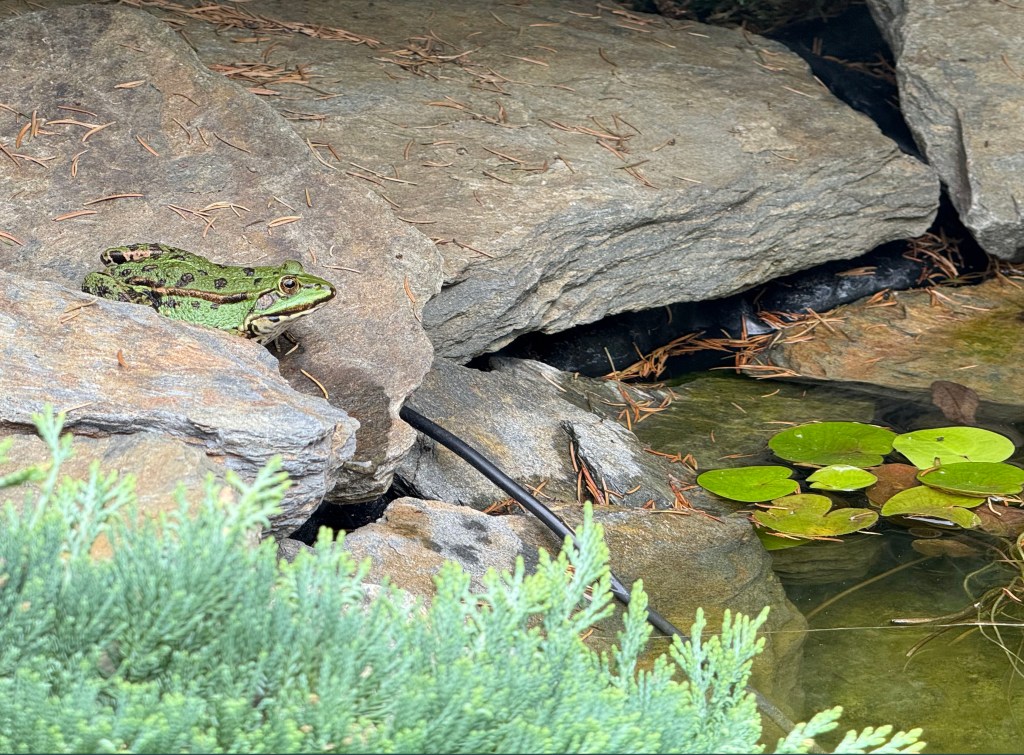 W oczku wodnym zamieszkała żaba Latem okna w ogrodzie zimowym były otwarte 24 godziny na dobę, a my z powodu wysokiej temperatury spędzaliśmy tam czas rano – na śniadaniach i późnym wieczorem. W ciągu dnia uciekaliśmy na ogród i leżakowaliśmy w pobliżu sadzawki. Nasze cytrusy, bananowiec i palma także spędziły lato poza ogrodem zimowym.