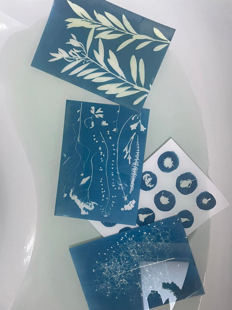 Płukanie cyjanotypów Cyjanotypy zmieniają w wodzie kolor na kobaltowy. Po dokładnym zmyciu odczynników, obrazy schną i już są gotowe.